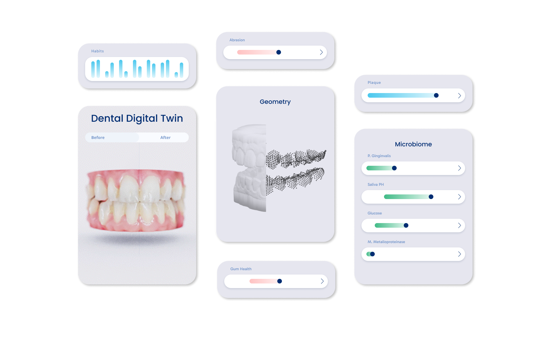 It captures your precise dental anatomy—including gum line, contact points, hard-to-reach surfaces, and tooth morphology—critical for effective oral care. This Digital Twin continuously evolves as you use our products, updated with your brushing behavior, anatomical changes, and real-time oral health data, becoming an increasingly accurate model of your unique oral physiology.